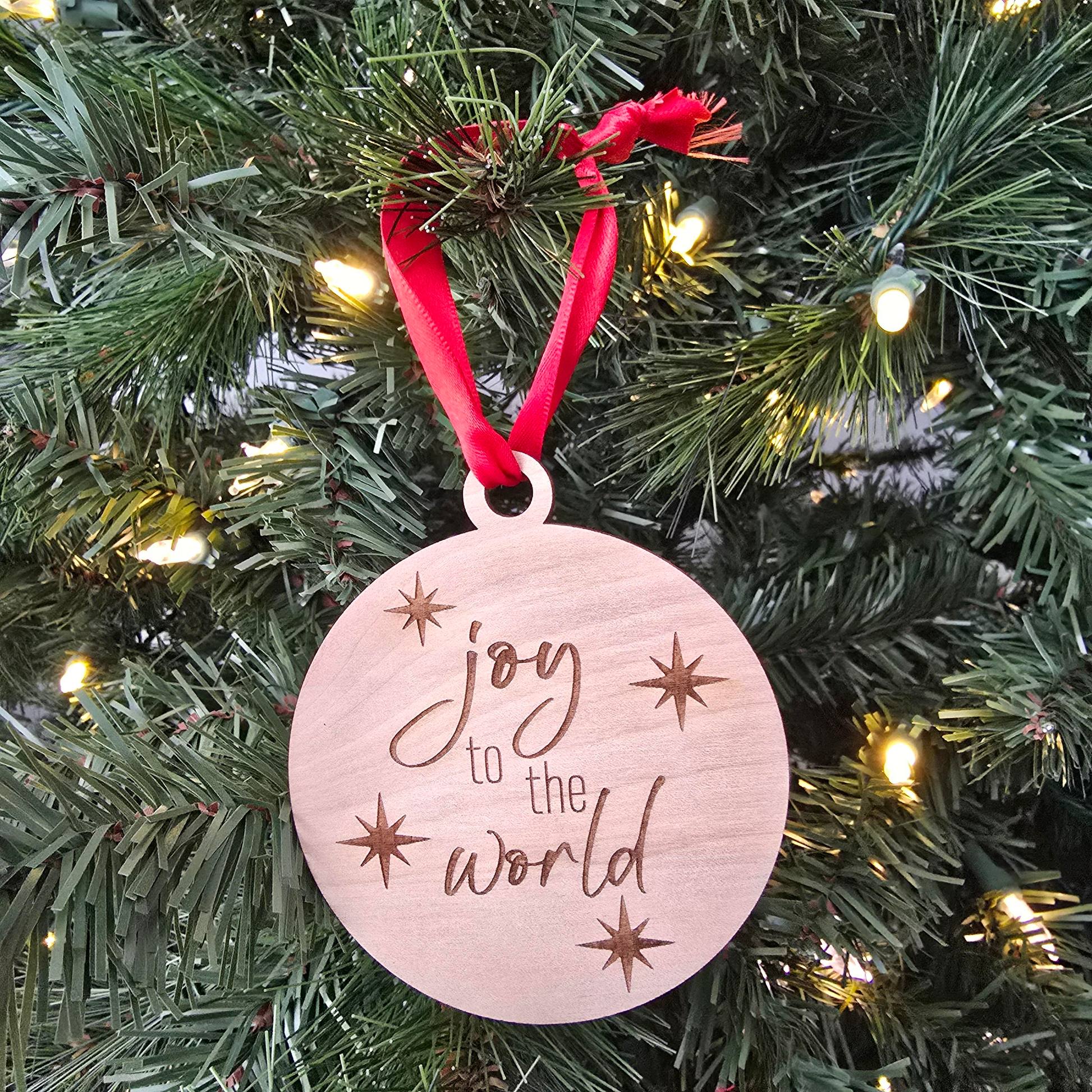 Your wooden ornament will be engraved exactly as shown and include the red ribbon. Each ornament is 3.5 inches in diameter.